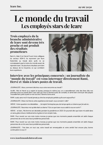 Immersion : Nous avons pris soin d'accorder beaucoup de temps et de réflexion par rapport à l'entreprise Icare et à l'immersion des joueurs dans les bureaux de celle ci. Nous avons créer des badges à donner aux joueurs pour leur permettre d'incarner plus facilement les personnages. Le maître du jeu a un rôle particulier car il cherche lui aussi à quitter l'entreprise et a les mêmes intérêts et objectifs que les joueurs.